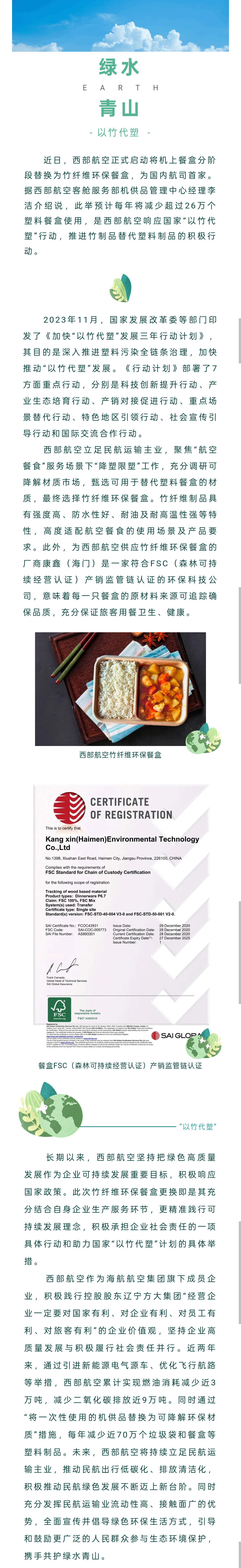 西部航空启用竹纤维环保餐盒 “以竹代塑”推动